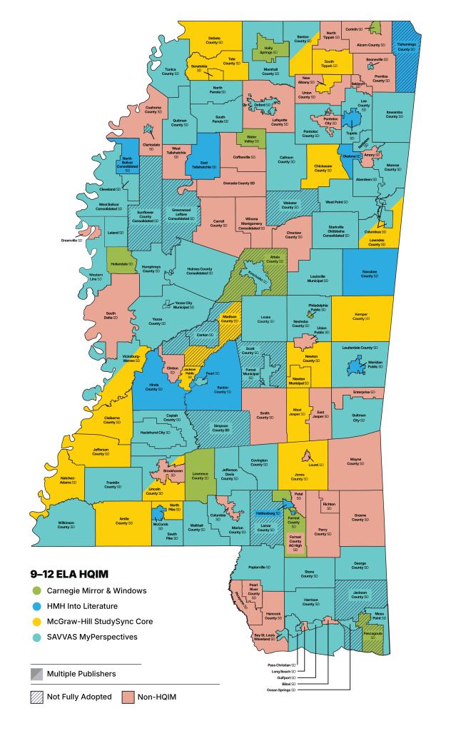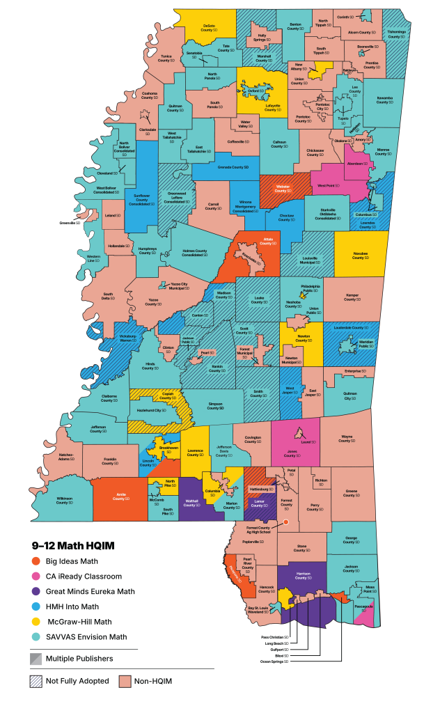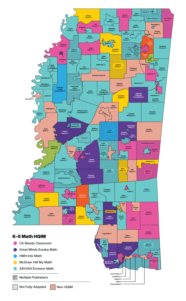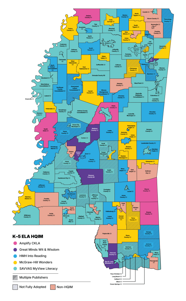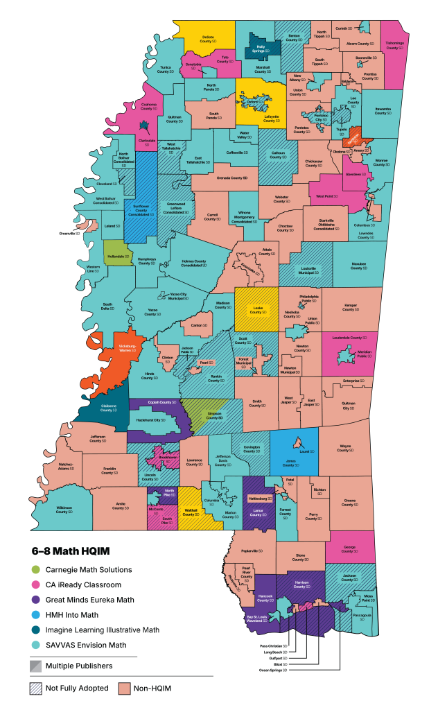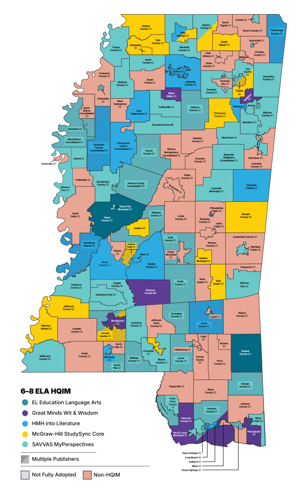 The High-Quality Instructional Materials maps display information provided by districts through surveys, support coaches, and the Textbook Inventory Management System on the ClassGather portal. If a district is shaded salmon, it indicates that the information has not been submitted. If you notice that the information is outdated, please email the Office of Instructional Materials and Library Services at esimmons@mdek12.org.