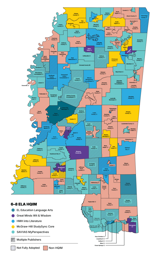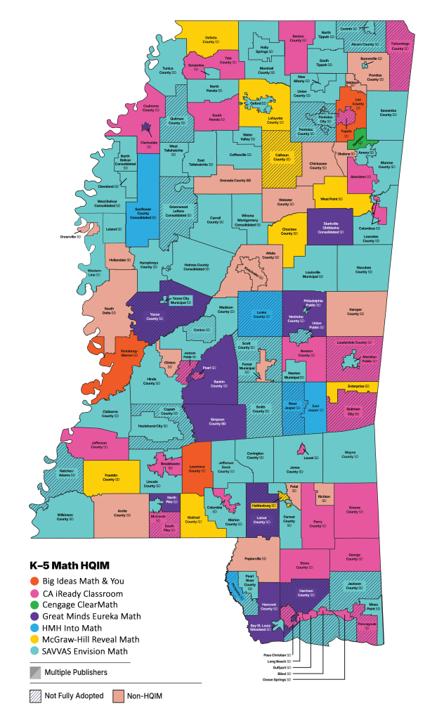 The High-Quality Instructional Materials maps display information from districts via surveys, support coaches, and the Textbook Inventory Management System on the ClassGather portal. If a district is shaded salmon, it indicates that the information has not been submitted. If you notice that the information is outdated, please email the Office of Instructional Materials and Library Services at esimmons@mdek12.org.