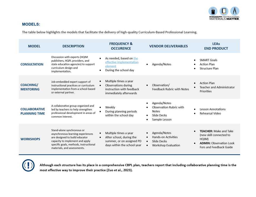 Curriculum-Based Professional Learning (CBPL) is a method of high-quality professional development that can significantly improve student outcomes. It ensures that teachers fully understand the state-approved high-quality instructional materials they use in the classroom and are prepared to deliver instruction that meets the Mississippi College- and Career-Readiness Standards (MCCRS). CBPL is closely linked to increased student achievement, as it equips teachers with essential skills, knowledge, and strategies for effective instruction, resulting in improved learning outcomes for students. When teachers engage in relevant, evidence-based, and ongoing professional development that concentrates on student needs, they become better equipped to foster student success.